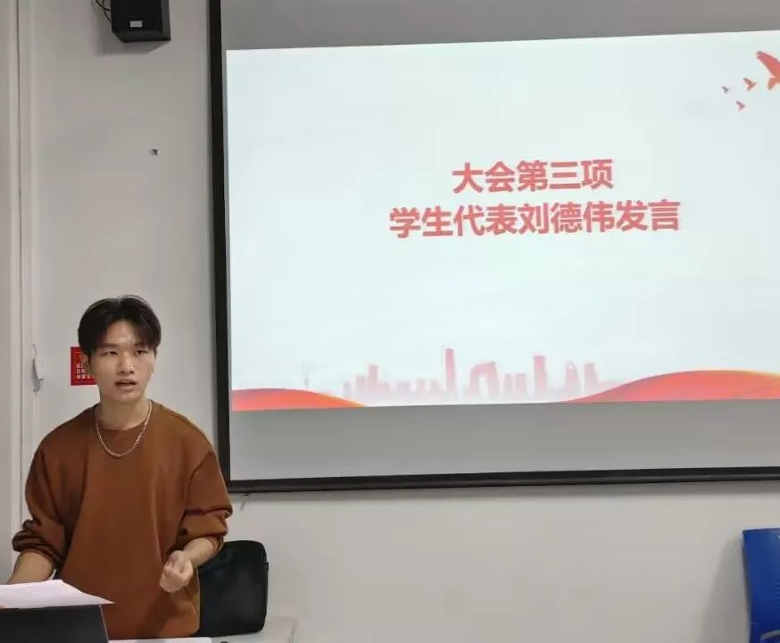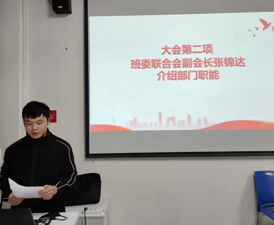 大会第二项,班委联合会副会长张锦达介绍部门职能。班委联合会主要分为四个部门。办公室主要职责是协助辅导员制定班级工作计划。年级部主要负责各年级辅导员与部门之间的联系,组织本年级员工日常管理工作。宣传部,发挥宣传事宜引领示范作用。资助部,协助辅导员完成评先评优,应征入伍等日常事务。