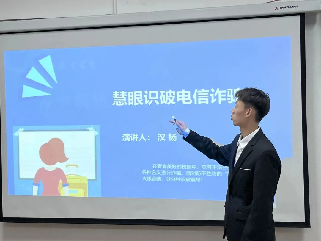 MK体育21服设本科5班汉杨作主题班会示范课分享。他分享的主题是防范电信诈骗,主要围绕什么是电信网络诈骗、电信诈骗的危害和如何预防电信诈骗做了分享,通过详实的案例,提高同学们的防骗意识。