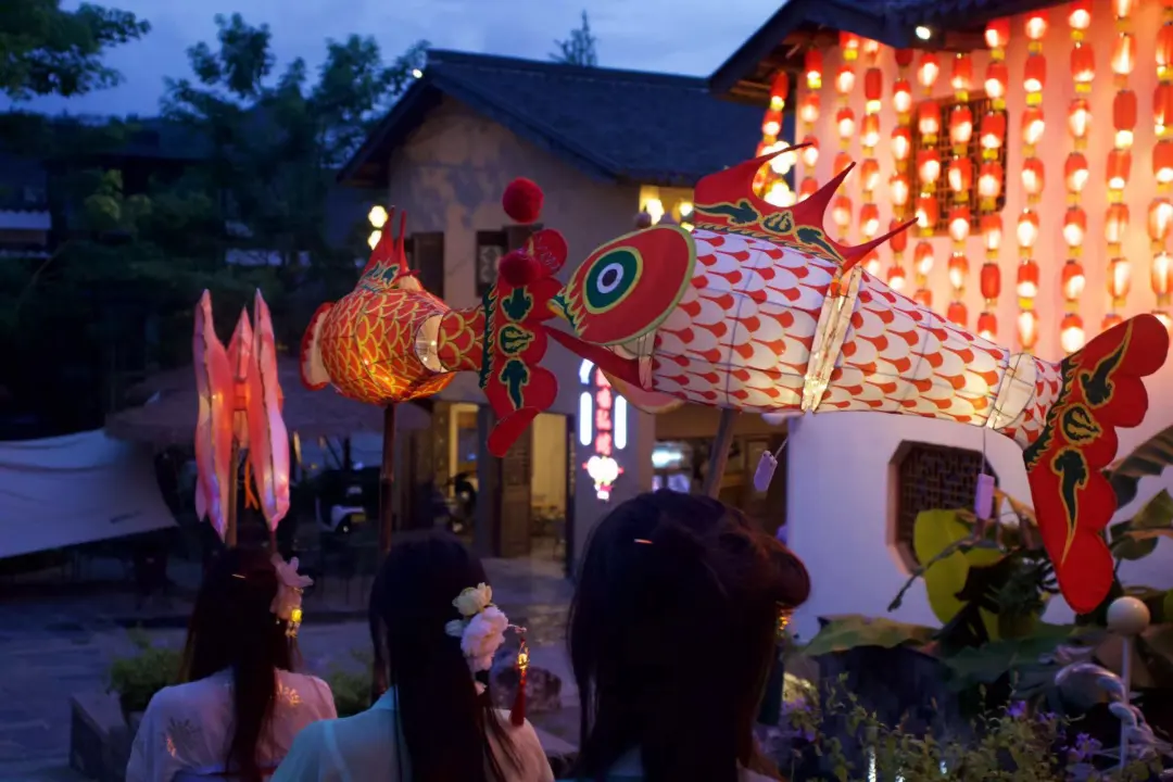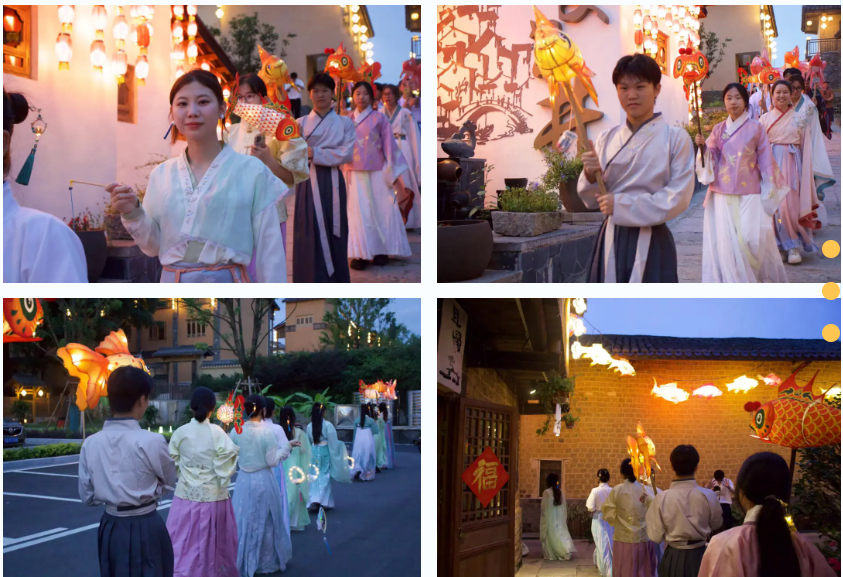 走进古城景区,古风韵味如潮水般扑面而来。道路两旁鱼灯高挂,灯火通明,将整个街道照得如同白昼。团队成员身着汉服漫步古街,一袭华裳,略施粉黛,那飘逸的裙摆随风轻舞,仿佛流淌着千年的诗意。女队员的发髻精致,步摇轻晃,叮叮作响;男队员则身姿挺拔,宽袍大袖,尽显儒雅之风。团队成员或驻足观赏街边的传统手工艺品,或在古色古香的店铺前流连忘返,或轻声交谈,笑声在这古老的街道上回荡。与古色古香的景区融为一体,让人仿佛置身于一场时空穿越之旅。脚下的青石板路,承载着岁月的痕迹;身旁的古建筑,诉说着往昔的故事。那雕花的门窗、斑驳的墙壁,无不透露出历史的沧桑与厚重。而身着汉服的他们,就像是从时光深处走来的古人,为这沉睡的古城增添了一抹灵动的色彩。