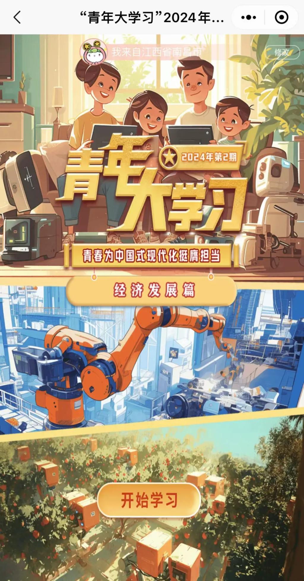 ①关注“江西共青团”微信公众号,点击公众号底部菜单栏“学习平台”,选择“青年大学习小程序”或者“青年大学习H5”进入,我们将定期更新学习链接。
