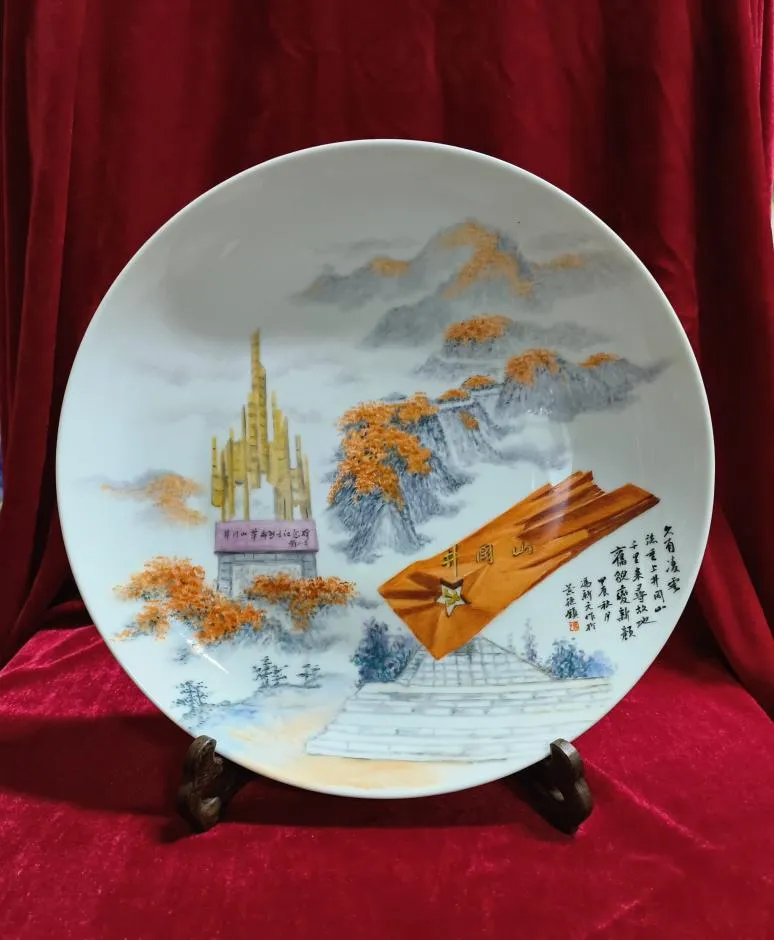 作者利用陶瓷绘画与书法相结合的形式缅怀伟人,抒发自己对毛泽东同志等老一辈无产阶级革命家的深深崇敬和爱戴。作品取名《忆井冈:热血与信念的铭刻》,灵感来源于井冈山上的红色文化建筑与秀美的景色。