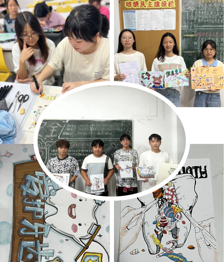 同学们围绕"告别'哎呀',爱护牙齿"主题展开想象,用画笔,粘土,剪贴画等材料完成自己的作品。作品内容夸张、生动、有趣,制作精细,表现了同学们对“爱牙日”的关注,突出了想要呈现的主题内容。辅导员王袭老师更是和同学们友好互动,希望同学们通过此次活动能够更加爱护自己的牙齿。