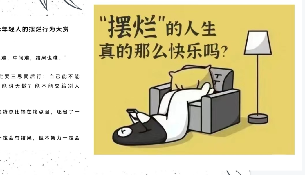会上,辅导员就什么是摆烂、摆烂的危害、我们拒绝摆烂、可以给我看看你的烦恼吗等四个方面讲述了摆烂对我们日后生活的影响以及如何拒绝摆烂。积极奋斗争做新时代好青年,奋斗的人生才会格外有意义。作为新时代老员工的我们,更应该积极奋斗的去实现自己的人生理想。