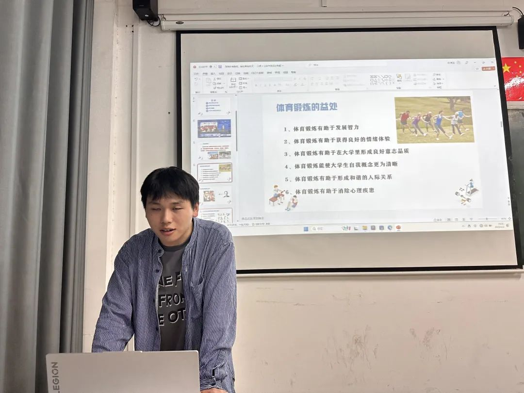 辅导员从体育锻炼的益处、如何加强体育锻炼、何为青春、老员工青春风采展示等四个部分讲述了我们老员工应该如何锻炼身体,展示青春风采;接着,辅导员讲述了体育锻炼具有调节人体紧张情绪的作用,能改善生理和心理状态,恢复体力和精力;体育锻炼能增进身体健康,使疲劳的身体得到积极的休息,使人精力充沛地投入学习、工作;舒展身心,有助安眠及消除读书带来的压力等四点关于锻炼的意义,让同学们更好地了解锻炼的益处、如何锻炼以及怎么展现老员工的青春风采。