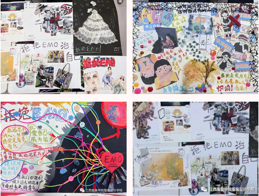活动伊始,同学们发散思维,自由组队,在有了想法之后纷纷拿出各种材料进行创作,有的同学制作五彩涂鸦画,把自己的负面情绪都释放在画纸上;有的同学剪下废旧杂志上的文字、图片,或其它综合材料,运用剪、贴、拼等多种方式制作成一幅幅美丽的拼贴画。下面让我们来欣赏同学们精心设计的优美作品吧!