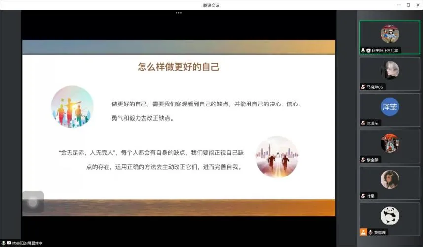本次班会从怎么样接纳自己、怎么样欣赏自己、怎样做更好的自己以及怎样激发自己的潜能等这四个维度出发。首先通过分享一位画家对于自身完美画作追求的故事,让大家明白“人无完人”,一味的回避拼凑反而弄巧成拙,要懂得接纳不完美的自己。接着,班主任们强调自信心的重要性,包容的态度去辩证看待自己的优点和缺点,激励大家要敢于面对问题,敢于挑战自我。最后,班主任通过韩信“国士无双”的例子,希望同学们能够正确接纳自己、欣赏他人。在生活中,做更好的自己,更好的自己,是在和他人共同生活的过程中不断成长,是在为他人、为社会带来福祉的过程中实现的。通过珍视自己的兴趣爱好,专注自己喜爱的领域;通过广泛参与多方面的活动,发现他人和社会对自己的需要;通过积极合作,与他人共同完成任务等等。