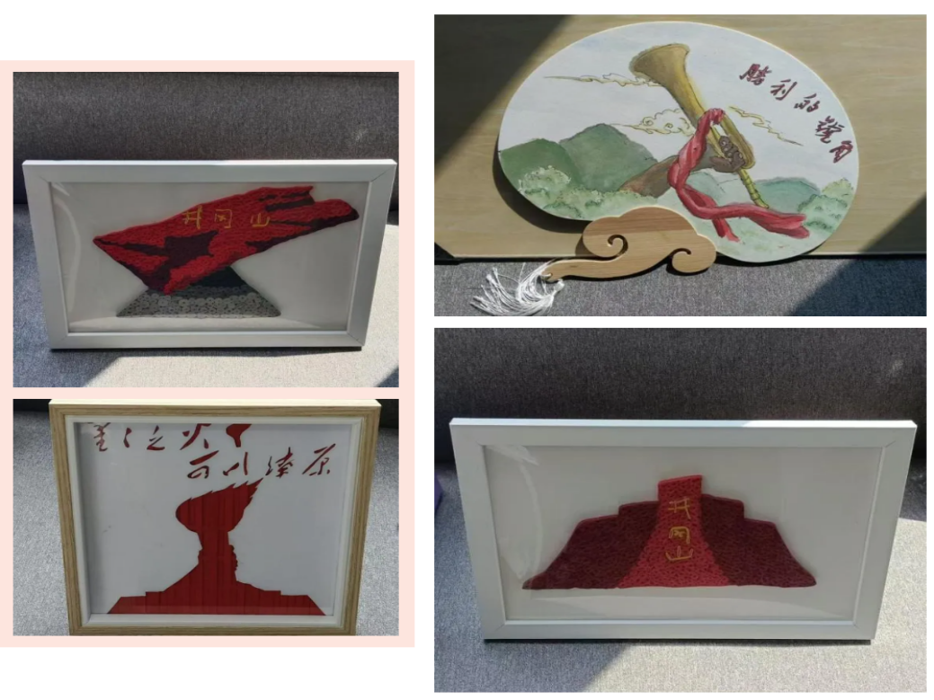 这一组作品也是以井冈山的红色建筑为灵感来源,用不同的方式制作,首先用绘画的方式将井冈山的著名建筑运用珠光水彩绘制在扇子上,“井冈山”三个字可以直观地展现作品的主题,“胜利的号角”代表着中国革命走向胜利,同时也有景色的描绘,做到了对井冈山精神的弘扬和对井冈山红色文化景点的宣传,然后运用不同颜色的衍纸,先绘画出大致图案,以纸为笔粘合而成,描绘出这代表着井冈山红色革命精神的雕像。还运用刻刀将火炬的外形和星火燎原的字体雕刻出来,随后用红色的竹编编织体现出来。感受井冈山精神和井冈山革命的热情,凸显主题。