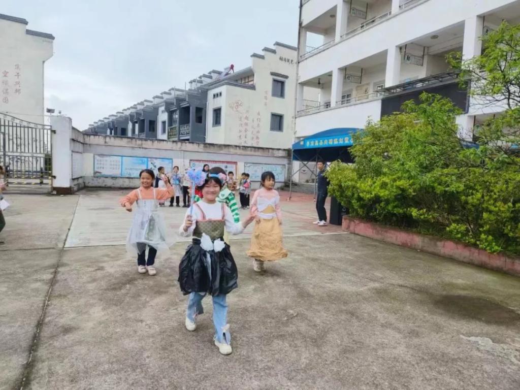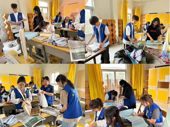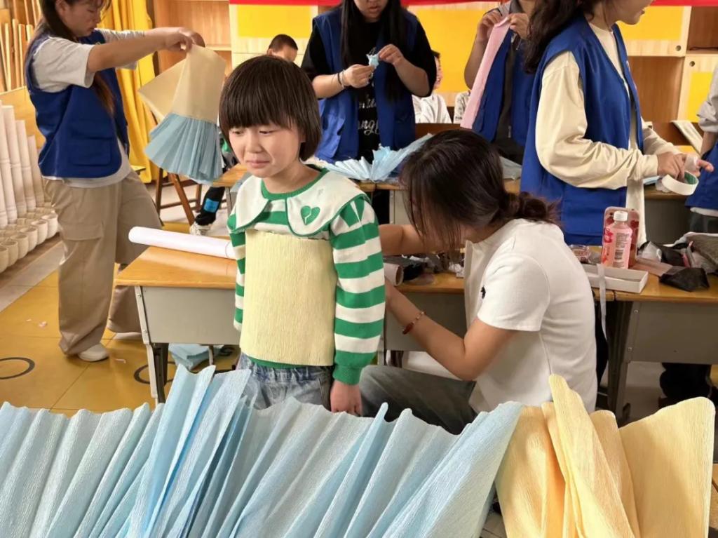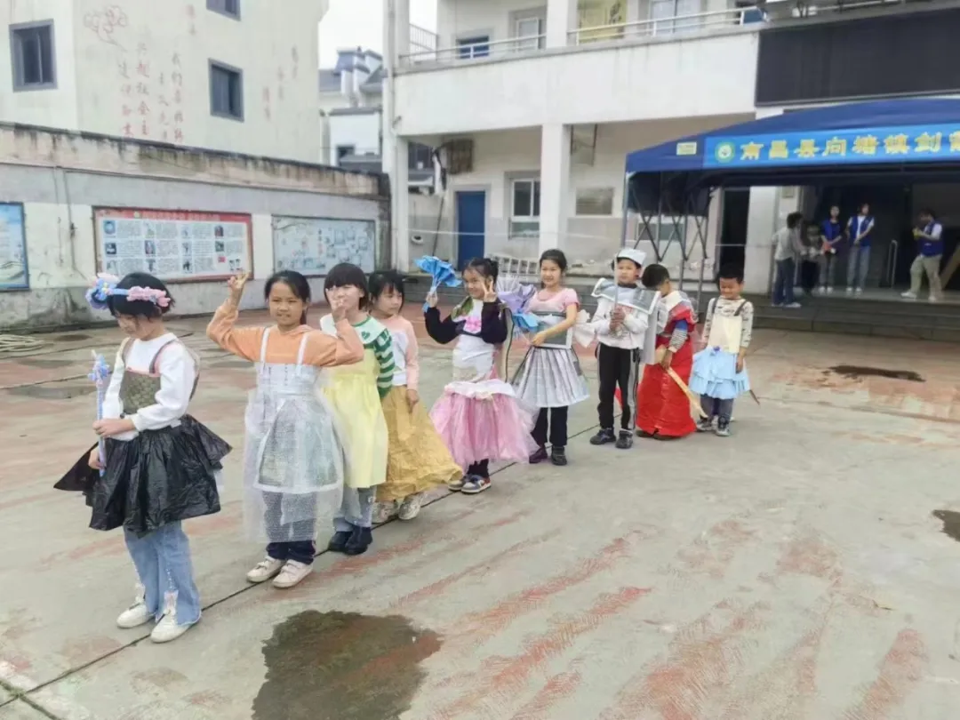 志愿者们来到剑霞小学与小朋友们一起用废旧物品做成时尚环保的服装。志愿者们结合自身专业特色将绿色环境资源和健康环保安全融入其中,通过各种材料做装饰,制作各种时尚服装,让孩子们感受到环保的重要性。