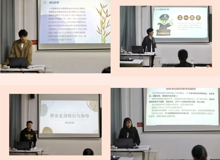 比赛开始,各班班长根据校园暴力、校园贷诈骗、宿舍安全、学风建设心理教育等主题展开班会讲述,通过观看各班班长所展示的精美详细的ppt,深入了解本次参赛所讲述的班会主题内容,凭借清晰的思路和有生动性的描述为大家展现了精彩的主题班会课。