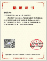 他说:“很庆幸我是18时装专科3班的一员,这个假期,我不仅感受到了不一样的氛围,更多的是感受到大家来自远方的爱。疫情来到初期,班级同学一起自发向武汉捐款,凝心聚力,希望可以通过自己微薄的力量传递爱心,整个中国都在行动,我们也不例外。暖暖中国心在行动,万众一心凝聚中国精神,我们从不畏惧任何一场挑战。风雨压不垮,苦难中开花,我们同在一起,这场战斗,中国一定会赢!” 待凛冬离去,雪融草青,久闭的家门一定会被春风敲开,中华大好河山一片绚丽。我们相约一起观岳阳、赏西湖景、看尽四月樱花烂漫,坚持住,没有什么能挡住春天的脚步,我们定会如期赴约江服。在此,18时装专科3班全体同学向全体奋战在一线的各行各业人士表示崇高的敬意。武汉加油!中国加油!