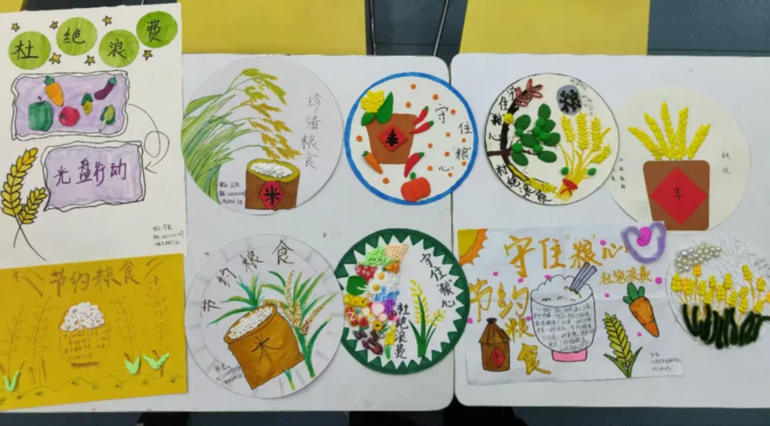 活动中,同学们以手工粘贴画、五谷粮食画、黏土塑造等中国传统民间艺术形式为媒介,巧妙融入创新理念。他们运用彩铅、素描、水彩等多种绘画形式,所创造出的作品立体感强,视觉效果明显,给人一种震撼、亲切的感觉。一幅幅作品描绘出“喜观稻菽千重浪”的丰收景象,更凝聚着大家对节约粮食的深刻理解。