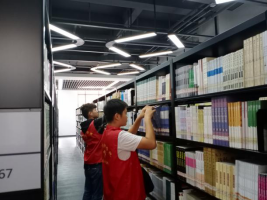 在图书馆相关人员和队长吕安燕的带领下志愿者们有序对书籍进行整理。全体志愿者分为两人一组对各楼层的阅读室和自己负责的区域进行打扫和书籍整理。