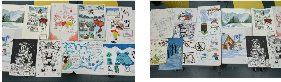 在本次活动中,员工巧妙地将节气主题融入水彩画、手抄报的创作之中,他们运用签字笔、马克笔等多种绘画技法,巧妙地将小雪主题表现出来并加以渲染,所创造出的作品温暖动人,给这愈发寒冷的冬日带来了一抹亮色。这些画作生动的描绘了“小得即圆满,雪落万物安”的温馨意境,“小雪”虽不会带来银装素裹,但寄托着同学们对雪花飘落的期待。“小雪”凝聚了这份期待,承载着同学们对于雪花飘落的美好期盼。