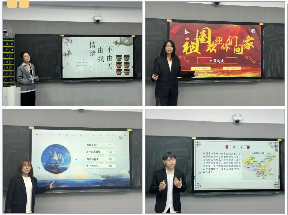 比赛开始,各班班长围绕“预防心理焦虑”,“你想成为什么人”,“乘风破浪,继往开来”,“人生是船,自信是帆”,“以青春之我筑红色中华”,“寻找自我与学会爱”以及“心存感恩,励志奋进”等主题展开班会讲述,各班长凭借着清晰的思路和有生动性的描述为大家展现了精彩的主题班会课。