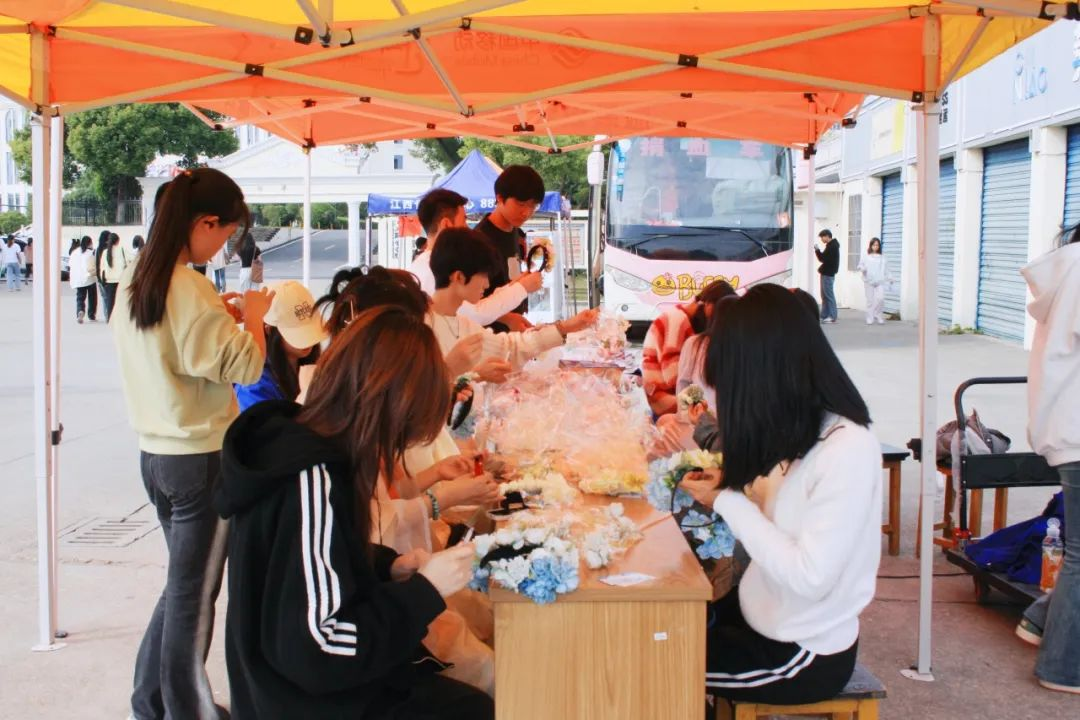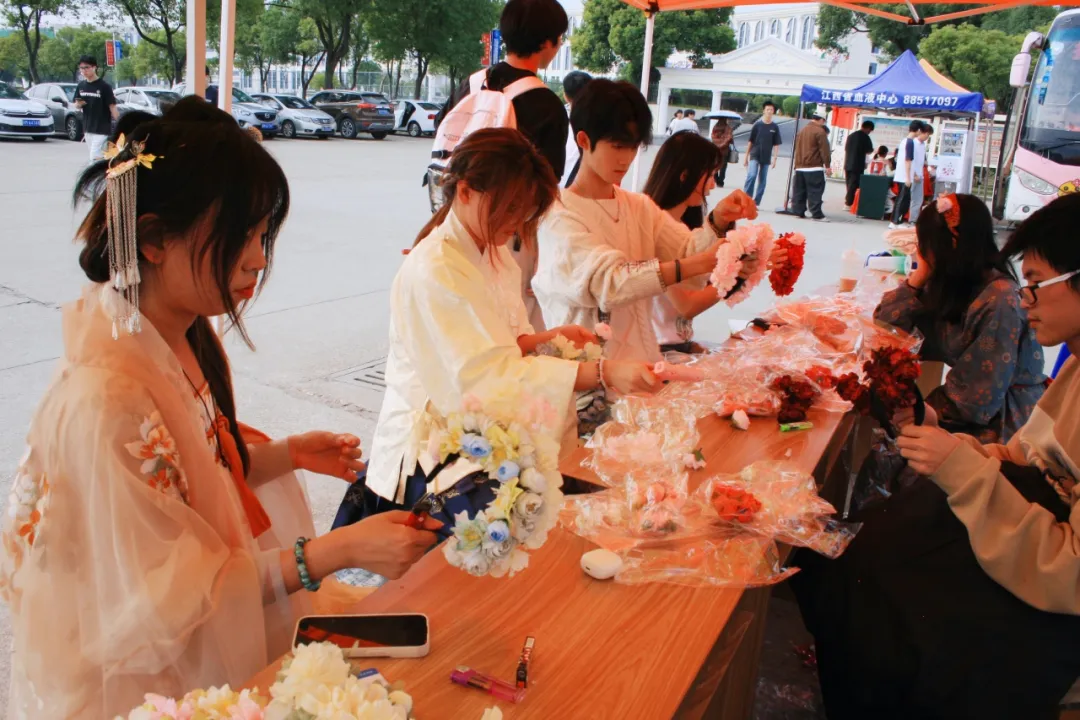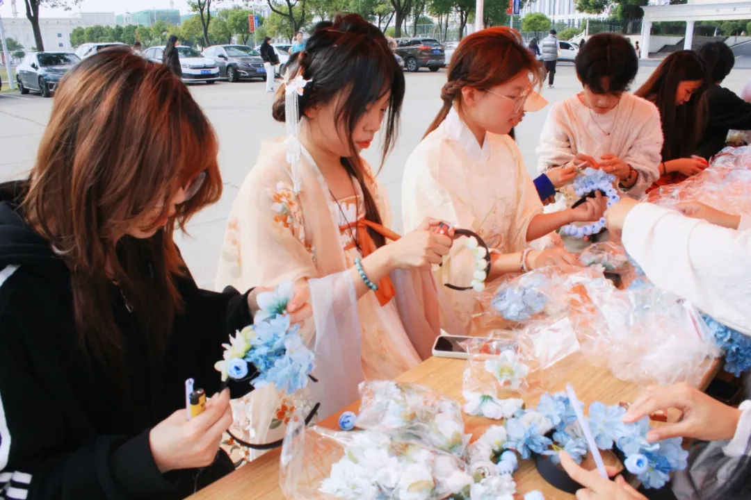 穿越时空的维度,深入簪花文化的历史长河。社团负责人为同学们详细介绍簪花的历史和起源并讲解和演示簪花制作过程。同学们通过使用胶棒固定与穿插组合技巧,对细节进行精准调整,以确保各部分无缝对接,呈现出栩栩如生的艺术效果。经过反复实践与创作,一朵朵仿真花卉在员工们的巧手中逐渐成形,打造出既精巧又典雅的簪花艺术品。