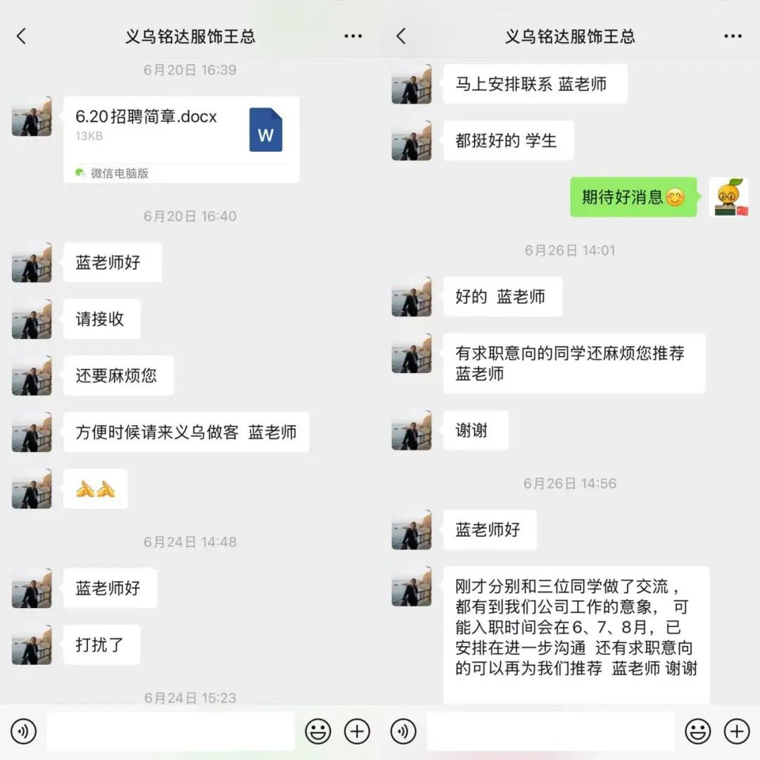 时间回溯到今年4月,公司通过微信主动联系义乌市铭达服饰有限公司,了解企业用人需求。企业人事负责人回复公司“当前公司正处于降本增效阶段,暂时没有招聘计划,如后续有招聘需求会第一时间和公司联系”尽管企业暂无招聘计划,但公司没有就此停止沟通,继续保持与企业的沟通互动,主动发送公司教学动态、特色专业成果、毕业生优秀毕业作品等,让企业更直观地了解公司人才培养质量。