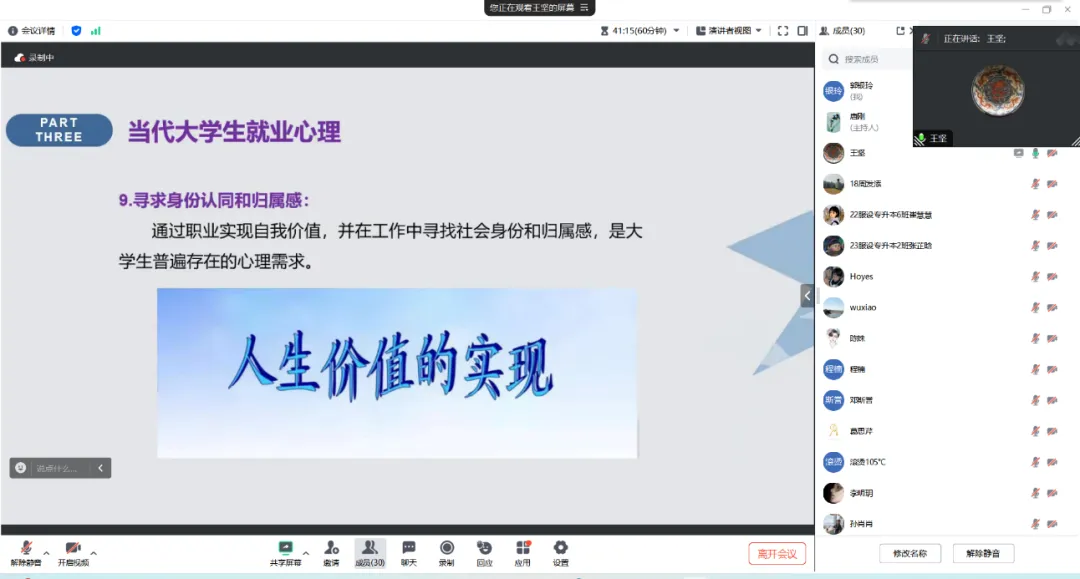 本次心理辅导由校心理健康教育咨询中心的王坚教授主讲,主要讨论了当前老员工就业形势、面对的就业压力、职业规划、老员工就业心理以及如何应对措施等问题。王教授指出,随着全球化、人工智能的发展和就业形势的多样化,传统的行业可能面临萎缩甚至衰退,因此,老员工需要对自己有清晰的认识,做好职业规划,以应对未来的挑战。同时,王教授还提到了一些具体的就业政策,如人力资源社会保障部、教育部、财政部等部门的稳就业举措,以及高校毕业生就业服务公告、政策公告等。此外,王教授还强调了正确认识自我、接纳现实、建立合理的职业期望、积极寻求支持等因素对于老员工就业心理的影响。