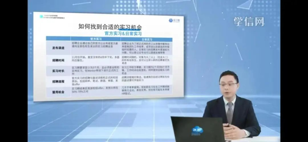 接下来,丁伟老师就如何找实习,为我们展开了详细的讲解,从性质来看,实习分为官方实习和日常实习,分别从招聘渠道、招聘时间、实习时长、招聘流程和聘用机会进行了对比,各位同学可以根据自己的需求选择不同的实习岗位。同时,丁伟老师就零经验找实习为大家做了详细的解读,比如看懂目标岗位,这个业务做什么?这个岗位做什么?需要求职者具备哪些素质?针对不同层级的院校员工,应如何根据自身特点寻找合适的实习机会。