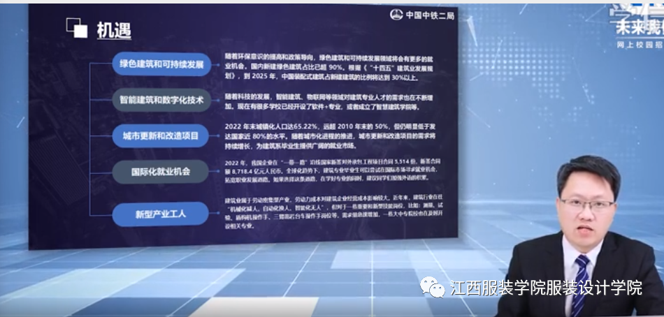 直播课邀请到中铁二局人力资源部副部长龙振,中交第三航务工程局有限公司人力资源部总经理助理费佳颖为同学们讲述建筑行业发展趋势和职业机会。