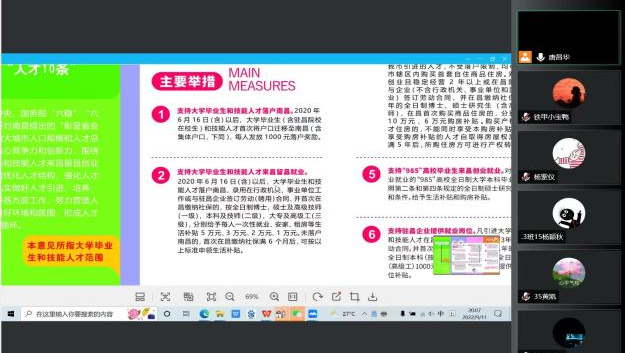 为贯彻落实党中央、国务院“六稳”“六保”决策部署和省委对南昌提出的“彰显省会担当”要求,不断做大城市人口规模和人才总量,大力提升南昌核心竞争力和创新力,围绕吸引百万大学毕业生和技能人才来昌留昌创业就业目标任务,持续优化人才结构,强化人才支撑,举全市之力扎实做好人才引进、培养、使用、服务、保障等各个方面工作,努力营造人才在昌创业就业的良好环境和氛围,形成人才合理有序流动的良性循环。南昌市出台《关于支持大学毕业生和技能人才来昌留昌创业就业的实施意见》,主要以落户有奖励、就业有补贴、创业有扶持、购房有实惠、岗位有保障等方面为着力点,提出了具体举措和量化指标。2022年9月11日晚19时,公司2022级、2023届各班班主任在主题班会上进行了《关于支持大学毕业生和技能人才来昌留昌创业就业的实施意见》宣讲。