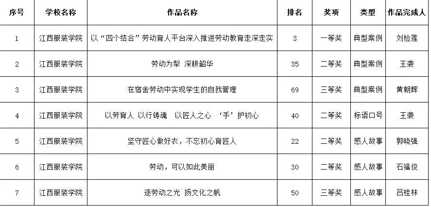 近日,江西省教育厅公示了关于2023年江西省大中小幼劳动教育宣传展示作品评选结果,公司喜获佳绩,共斩获二等奖2项,三等奖1项。王袭老师的作品《劳动为犁 深耕韶华》在劳动教育典型案例中获评二等奖;王袭老师的作品《以劳育人 以行铸魂 以匠人之心 ‘手’护初心》在劳动教育标语口号中获评二等奖;吕桂林同学的作品《逐劳动之光 扬文化之帆》在劳动教育感人故事中获评三等奖。