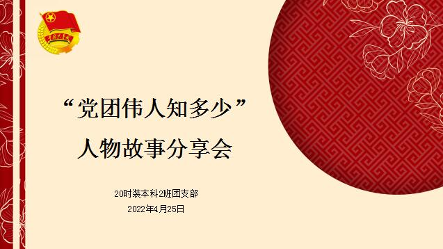 为庆祝建团100周年,教育引导团员员工学团史、强信念、践使命、跟党走,以昂扬姿态践行社会主义核心价值观,传承红色基因,勇担青春使命。20时装本科2班团支部于2022年4月25日线上开展“党团伟人知多少”人物故事分享活动,班主任孙肖肖及20时装本科2班团支部全体团员参与,活动由团支书张孝静主持。