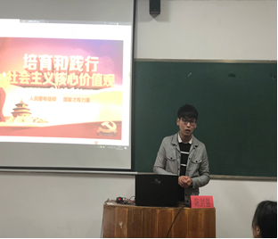 辅导员陈剑强对社会主义核心价值观基本内容进行讲解,生动形象的为同学们介绍了富强、民主、文明、和谐;自由、平等、公正、法治;爱国、敬业、诚信、友善这24字的深层含义,更好的让同学们认识了解了中国梦、民族梦,从而转化成我们的梦。