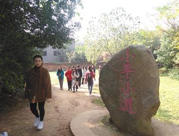 1969年10月,65岁的邓小平被扣上“走资派第二分子”的帽子,被下放到江西省新建县拖拉机修配厂进行劳动改造。直到1972年2月调回北京,邓小平在这里工作了3年4个月,也思考了3年4个月。一开始,小平从住处到工厂有半个小时的路程,后来考虑到小平同志的安全问题,工人师傅们便从工厂后门开辟了一条径直通往小平住处的小道,即世人所称的“小平小道”。这是一条平凡小道,然而就是在这样一条极其普通的小道上,小平同志构想出一条有中国特色的社会主义,把亿万中国人民带向富裕之路,使中华民族从此走向富强的康庄大道。