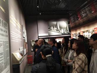 在解说员的带领下,同学们依次参观了"小平小道"纪念馆区、“小平车间”、“小平小道”、“小平铜像”。在纪念馆区,一幅幅珍贵的老照片静静地讲述着小平同志在拖拉机厂工作的前前后后;老式的电视机,缝纫机,旧工作服,斑驳的拖拉机似乎仍旧留着小平同志的痕迹。走出主馆,来到工作车间,一进去就有浓浓的机油味道扑面而来,而高龄的邓小平同志就是在这样的环境中工作着。从厂区出来,沿着小路,来到厂区后门,就是那条著名的小平小道,小道弯弯曲曲,一直通向南昌陆军公司的将军楼——邓小平在南昌工作期间的住处。由于陆军公司是军事管辖区,大家不能真正感触到这条小道过往,但大家都驻足在此,耳畔似乎有微微风声,眼前似乎是那个坚定的小个子在小道上迈着缓慢而坚定的步伐的情景。