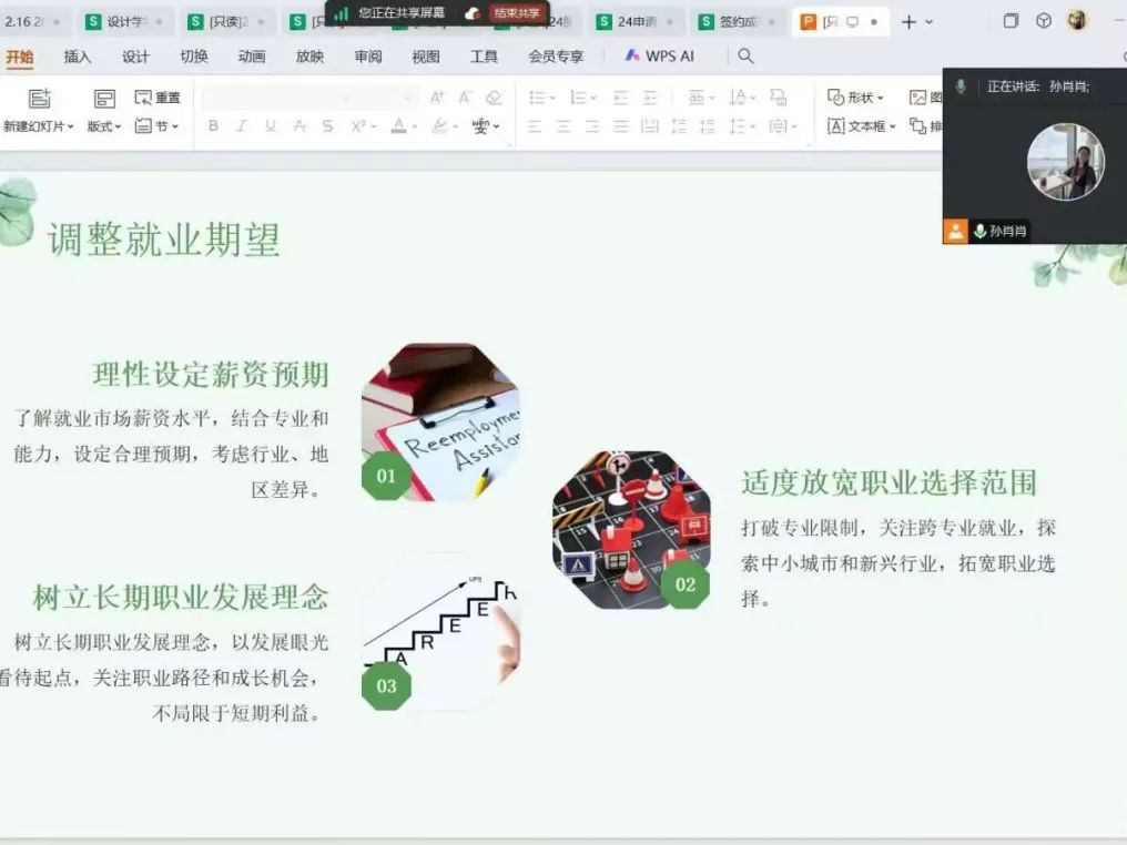 班会伊始,辅导员围绕“如何调整就业心态”展开,从就业焦虑成因、自我认知与心态调整、就业准备与应对策略、心理调适与支持、总结与展望五部分进行分享。希望同学们能够以积极的心态面对挑战,充分准备,相信同学们一定能够找到满意的工作。在职业生涯中持续学习和成长,为未来的职业发展打下坚实的基础,开启属于自己的美好职业生涯。