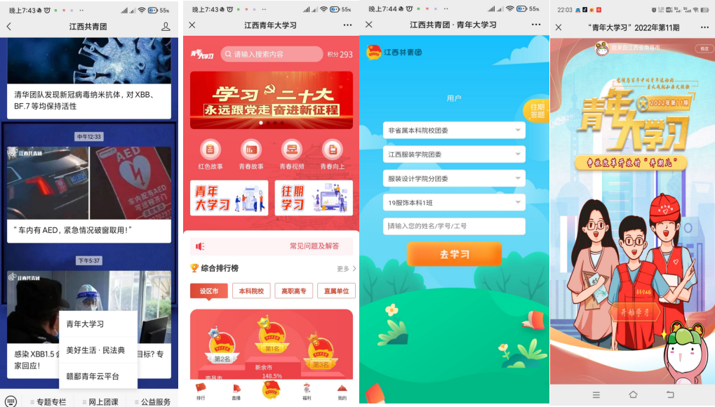 ①关注“江西共青团”微信公众号,点击公众号底部菜单栏“网上团课”进入答题,选择“青年大学习”,我们将于每周一中午12点更新学习链接。