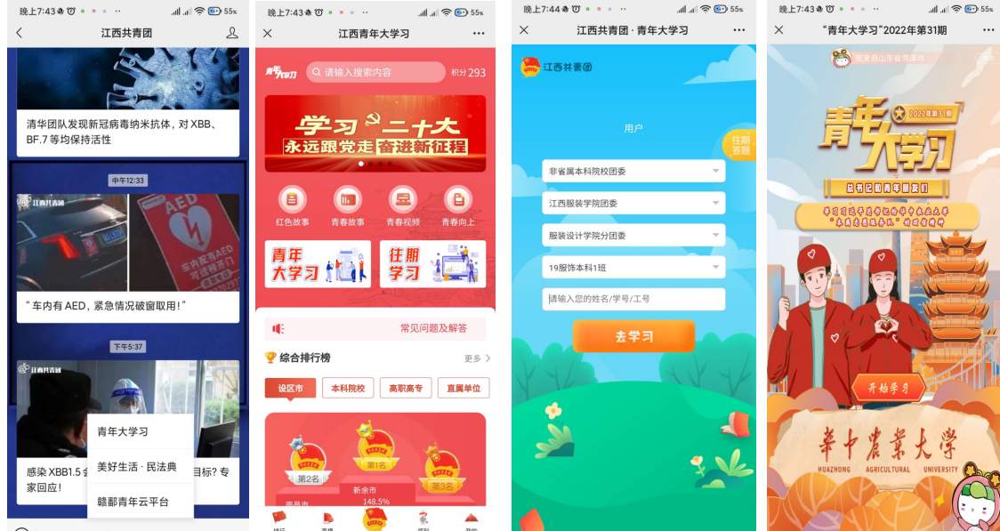 ①关注“江西共青团”微信公众号,点击公众号底部菜单栏“网上团课”进入答题,选择“青年大学习”,我们将于每周一中午12点更新学习链接。
