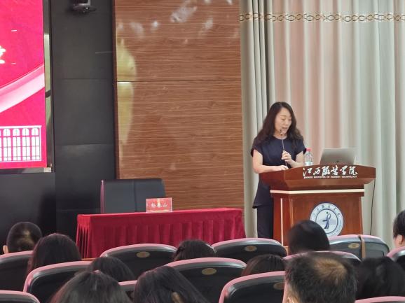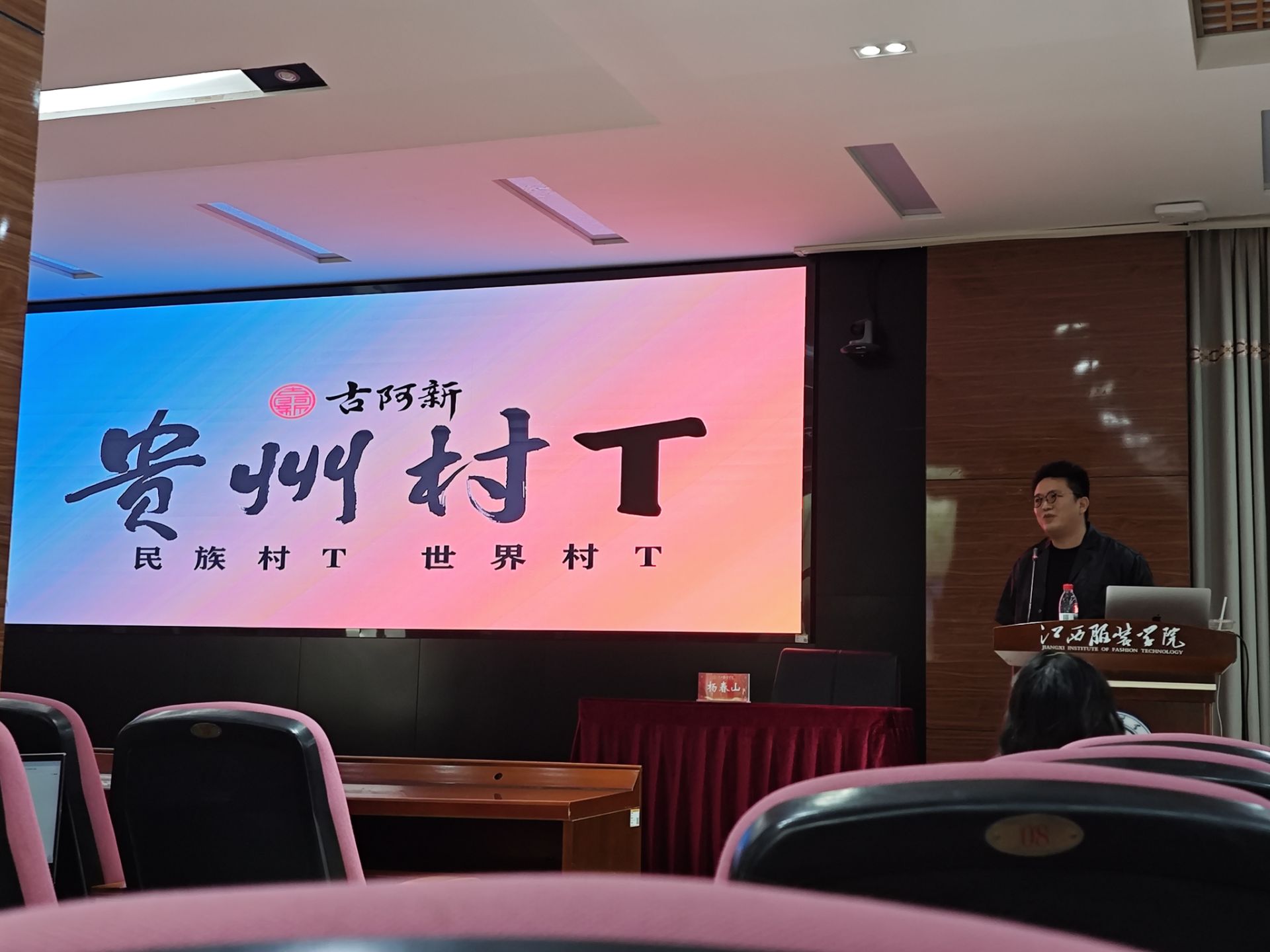 讲座伊始,杨春山先生以一段亲切的自我介绍拉开序幕,向在场老师阐述了自己品牌“古阿新”的起源与内涵,这个名字不仅承载着对传统技艺的尊重,更彰显了创新与传承并重的品牌理念。杨春山先生结合亲身经历讲述自己如何将苗族刺绣等传统非遗技艺融入现代服装设计中,打造出既具有民族特色又符合当代审美需求的时尚单品。