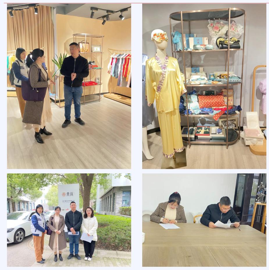 苏州上久楷丝绸科技文化有限公司是一家从事真丝绸(宋锦)及其制品的研发、设计、生产和贸易的企业。公司党委副书记周洪英与企业在岗员工和2024 届实习生进行了亲切座谈,在企业总助理的陪同下带领同学们参观了企业生产车间、非遗宋锦工作坊等。