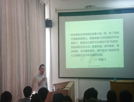 接着,黄老师向同学们解释了我们即将面对的未来。普通技术人员将大量失业,学者起到支撑作用,教师作用更重大,新中产阶级群体快速膨胀,商业意识成为各界职业者的必修课,艺术文化成为最时尚的事业。他还说到,我们是艺术家、设计师,是技术人员,是管理者,是学者,是教师,是员工,是多重角色者。在这个复杂的、充满变数的新时代,没有从一而终的、恒久不变的角色定位和努力目标。为了适应一个“新”字,我们显然比以往要付出得更多——每个人都要成为新物种!他建议同学们应以权衡自我、树立自信的心态,以斗志昂扬、包容乐观的姿态,以克服浮躁、脚踏实地的状态,以立志大我、弱化小我的胸怀,以客观评价、富有担当的定位,以重视志趣,兼顾需求的目标来应对这个新物种、新势力横行的时代。