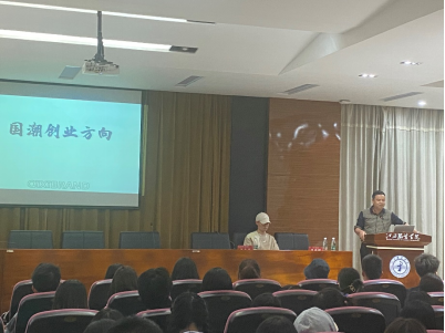 会中,QIXIBRAND品牌主理人阿杰向同学们介绍了自己一路以来的创业过程中遇到的种种问题,言传身教了他的潮牌创业经验。创业首先要明确方向,选择喜欢的方向和赛道去学习、研究;再者需明确客群,了解受众的兴趣、审美、品味等;最后,永远保持热爱、激情和坚持。作为已毕业的阿杰学长还向同学们介绍了自己在校读书期间做了什么,能做什么,为正在迷茫期的同学们指引了一条清晰的方向。专业技能上,寻找自己喜爱的风格并一直研究,扎实学习工艺、结构、打版等专业性较强的课程,了解行业相关资讯,掌握市场动态。综合能力上,鼓励同学们提高社交能力,拓展圈子,积极参加公司社团活动。同时,阿杰学长向同学们生动的讲解了服务设计的重要性,并以QIXIBRAND吊牌为例讲解了服装品牌该如何进行服务设计。最后,阿杰学长表达了自己做国潮的原因,鼓励同学们将中国优秀传统文化融入现代服装设计,并详细介绍了服装设计大赛“国潮设计”赛事流程、要求等。