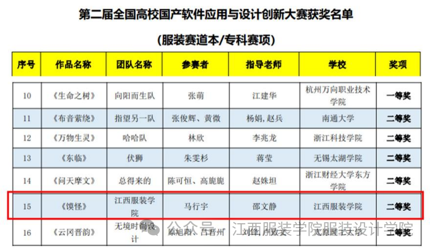 2023年12月30日,由浙江凌迪数字科技有限公司主办的第二届全国高校国产软件应用与设计创新大赛进行了线上决赛答辩。经过激烈的角逐,公司20时装本科1班马行宇同学以作品《馍怪》获得了服装赛道二等奖。