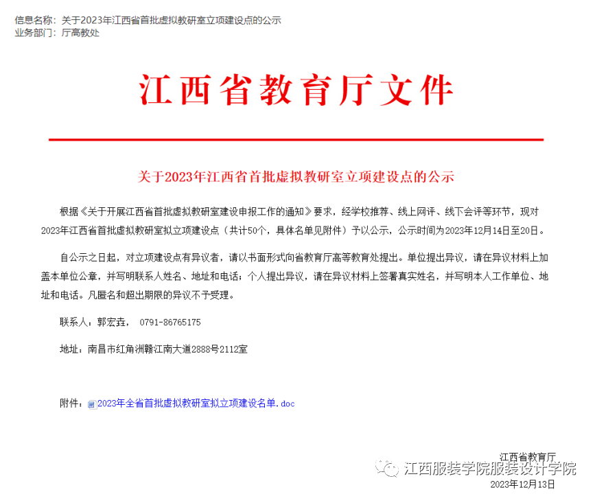 根据《关于开展江西省首批虚拟教研室建设申报工作的通知》要求,经过公司的推荐、线上网评、线下会评等环节,2023年12月13日,江西省教育厅公布了《关于2023年江西省首批虚拟教研室立项建设点的公示》,公司张宁经理的虚拟教研室项目《服装与服饰设计专业虚拟教研室》成功获批2023年江西省首批虚拟教研室拟立项建设点。
