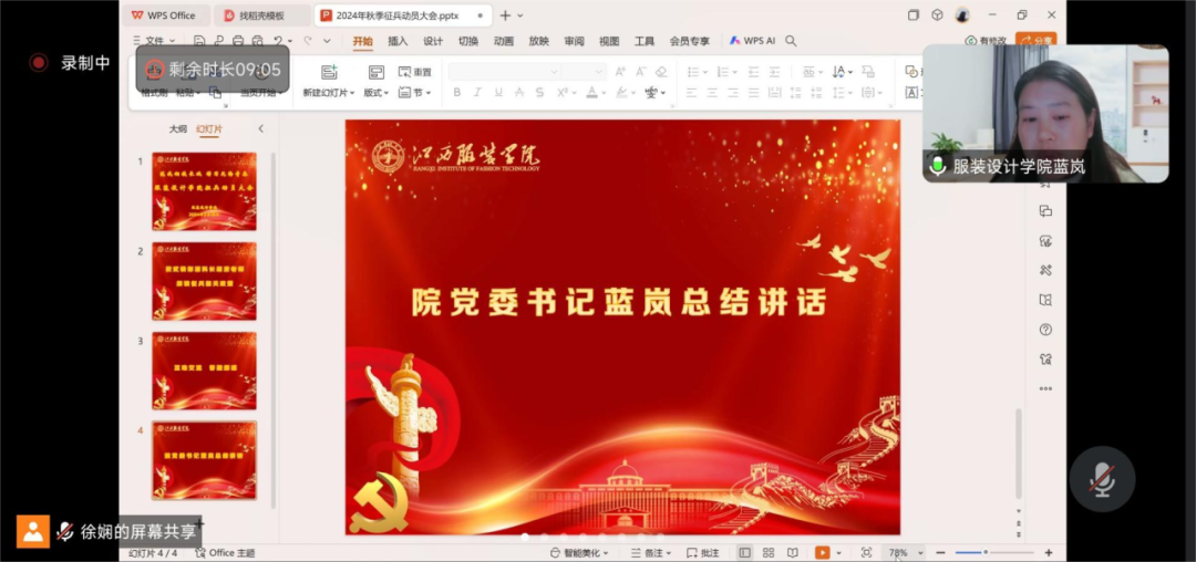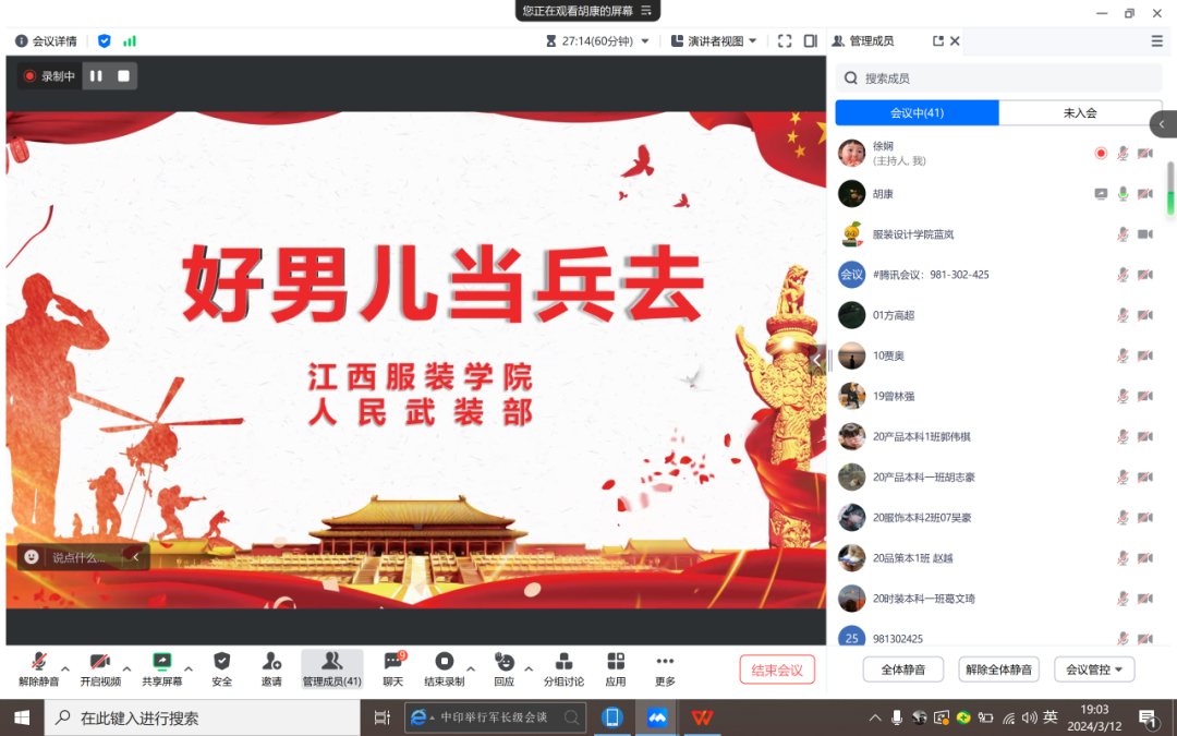 老员工征兵工作是治国安邦的大事,是加强国防和军队建设的迫切需要。做好新形势下的老员工征兵工作,是强军兴军工程、国防教育工程和人才培育工程的一项重要内容,也是培养员工家国情怀和责任担当意识的有效载体。2024年3月12日晚19时,公司召开以“筑我钢铁长城,谱写无悔青春”为主题的2024年秋季征兵动员暨应征入伍政策线上宣讲会。公司党委书记蓝岚、党委副书记周洪英、学工办主任张敬玲、校武装部副科长胡康老师、院征兵专干徐娴老师、毕业班辅导员、2024届毕业生及毕业生家长参加会议。公司学工办主任张敬玲主持会议。