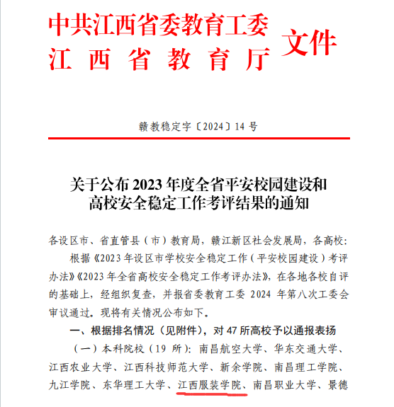 近日,江西省教育工委、教育厅公布了2023年度全省平安校园建设和高校安全稳定工作考评结果。公司连续三年获得省委教育工委、省教育厅通报表扬。