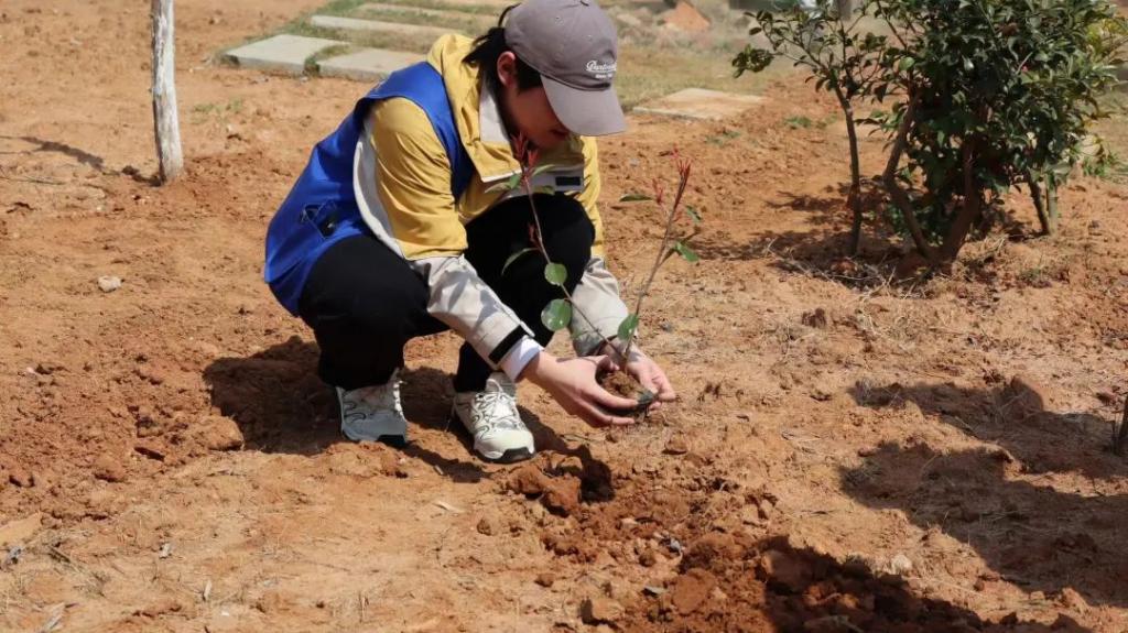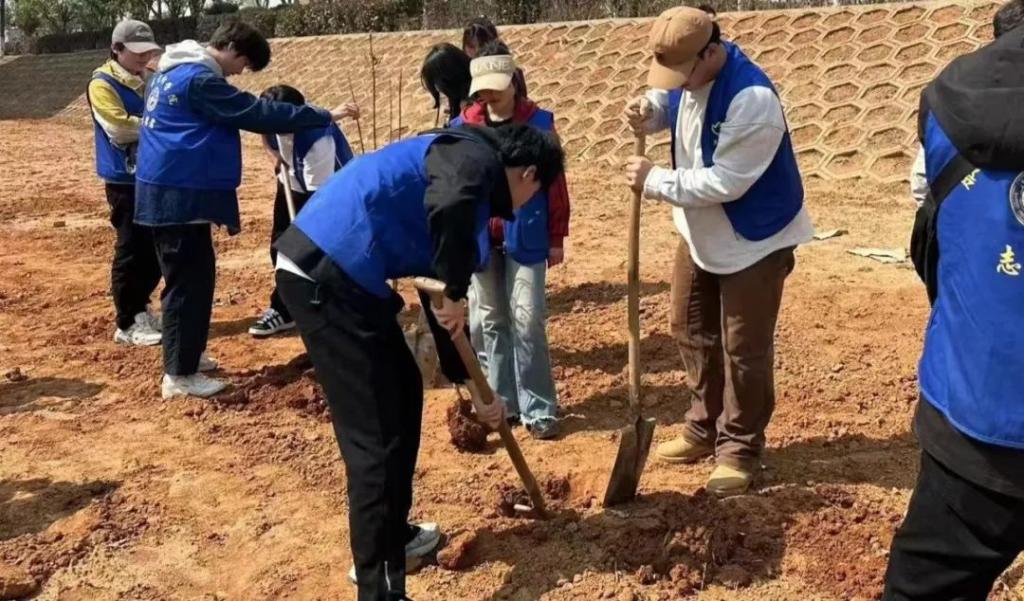 志愿者们手持铁锹、水桶和树苗聚集在植树点,等待着植树活动的开始。从土壤松土和铲除杂草的前期准备工作,到铲土和树木种植的中期工作,再到浇水和施肥的后期收尾工作。志愿者们分工合作,默契携手,共同装点着美丽的江服校园。