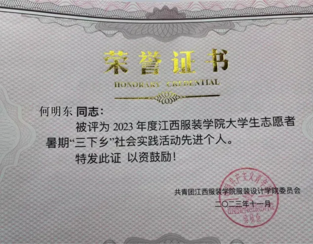 此外他还积极参与各类志愿服务,积极践行志愿服务精神,2023年6月,何明东同学作为队长协助指导老师带领MK体育官“红色绣花针”社会实践团队,积极响应党和人民号召,弘扬和践行社会主义核心价值观,走进井冈山、走进乡村,前往江西吉安井冈山市柏露乡柏露村、长富桥村等进行三下乡社会实践活动。在此次三下乡中,“红色绣花针”社会实践团队入选2023年全国大中专员工“三下乡”社会实践活动之乡村振兴“笃行计划”专项行动全国示范性团队,并在同年十月被评为公司2023三下乡实践活动“优秀实践团队”。数百小时志愿服务,何明东同学的身影永远伫立在一线,充分地展现了江服学子的大爱担当及青春的青春初心使命。