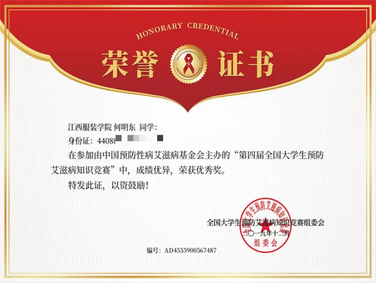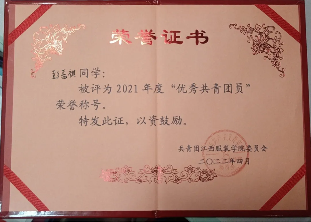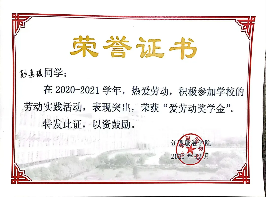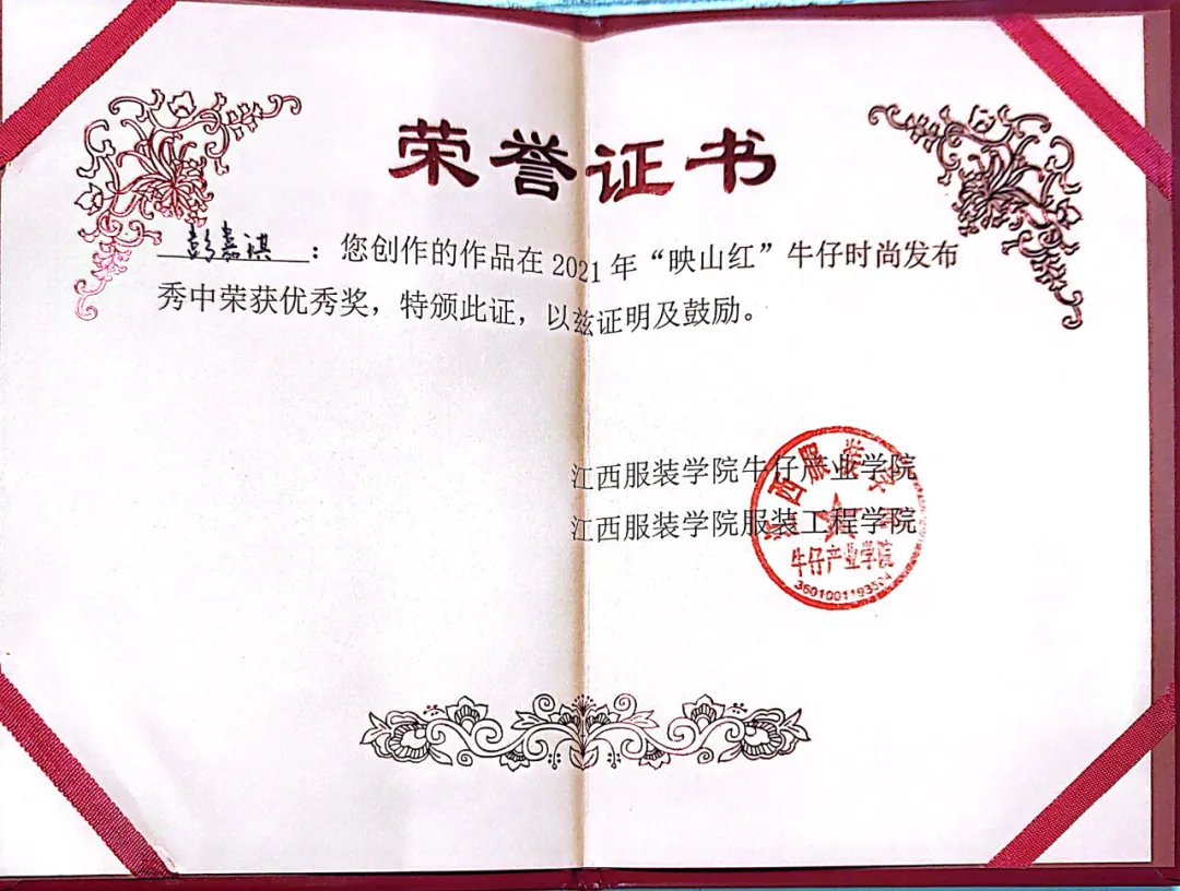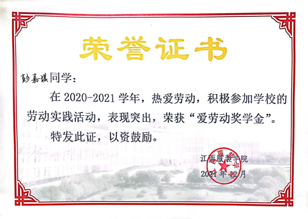 曾获“国家励志”奖学金、校二等奖学金、“第三届中国国际华服设计大赛”优秀奖、“映山红”牛仔时尚发布秀优秀奖、“爱劳动奖学金”、“优秀共青团员”荣誉称号、“守护心灵,茁壮成长”心理情景剧大赛第一名、MK体育官第十九届网球比赛中荣获女子组第六名,通过全国大学英语四级考试、国家普通话水平测试(二级甲等)、参加MK体育“一支红色绣花针”三下乡活动等。