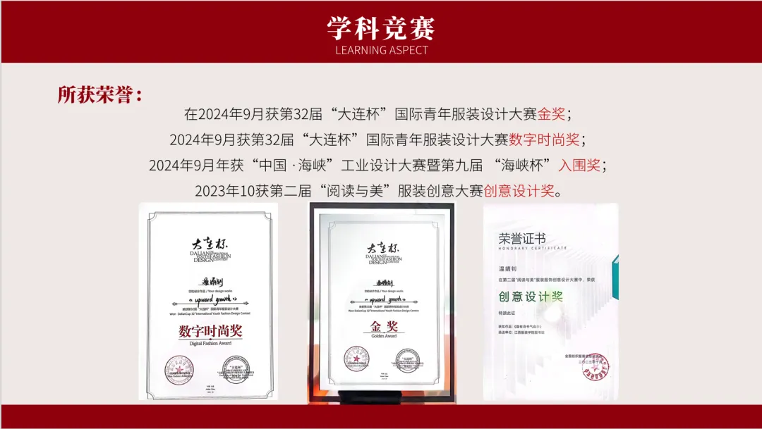 2023年9月荣获第32届“大连杯”国际青年服装设计大赛金奖;