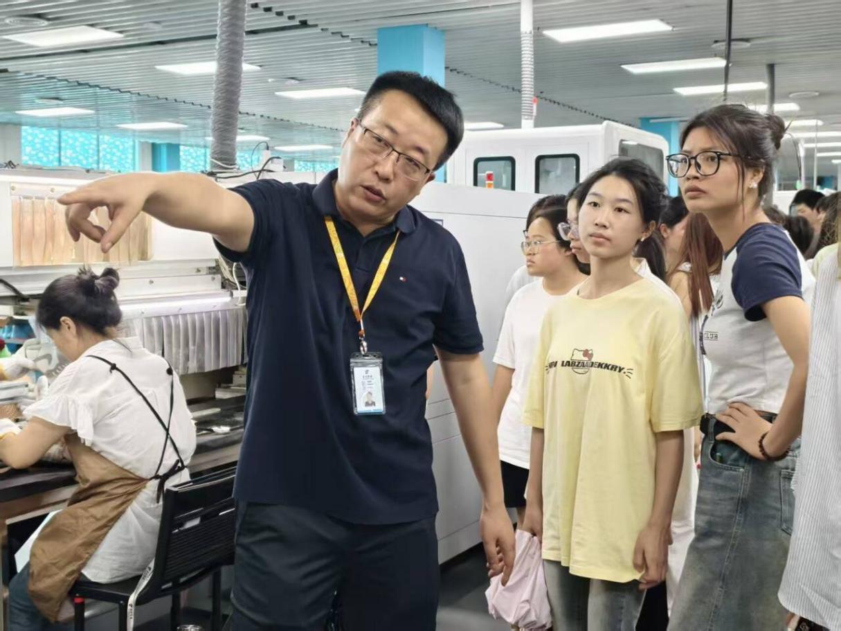 随后进入车间学习,同学们都表现出了极大的好奇心和学习的热情。首先来到的是自动化裁剪车间,车间负责人赵主管为我们讲解了自动化裁剪的流程,从工艺单的解读,到材料的排版,再到部件的裁剪、清点等,全部都是电脑和机器来完成,工人只要坐在电脑前输入指令,主管只要视察车间墙上的显示屏情况即可。最后,他指出科技进步和数字化转型为制鞋行业带来的巨大机遇,鼓励同学们要具备全局视野和创新精神,勇于面对各种挑战,积极抓住机遇,为未来职业发展奠定坚实基础。相信在领导的悉心指导和公司的良好平台上,同学们一定能够不断成长,为制鞋行业的发展贡献自己的力量。