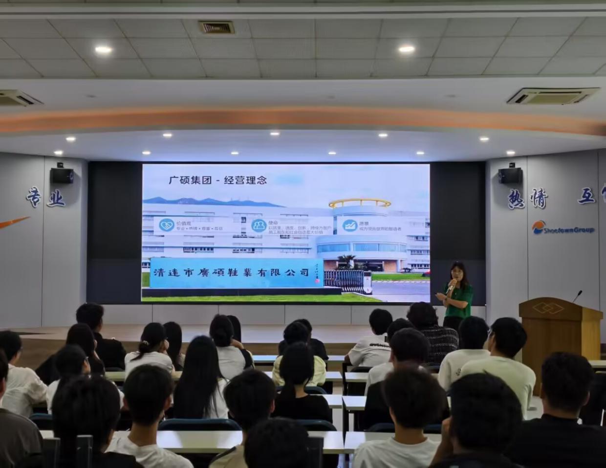 广宥现代化的公司氛围瞬间吸引了同学们的目光。在公司领导的热情接待下,同学们首先来到了公司的大会议室,人事部刘经理给同学们介绍了公司集团(广硕)概况,以及分公司(广宥)的基本情况。接着公司宗鹏程协理为同学们上了一堂别开生面的专业课,他先以自己的从业经历开始讲述了自己与鞋结缘的故事,瞬间拉近了与同学们的亲切感。随后以其丰富的经验、专业的视角及深厚的行业洞察力,深刻剖析了当前制鞋行业的整体动态和趋势。从市场需求的变迁、消费者偏好的趋势,到行业面临的种种机遇与挑战,为同学们精心描绘了一幅既全面又清晰的行业发展蓝图。再从制鞋原材料的甄选、设计稿的绘制,到裁断、缝制、成型等方面给同学们讲解了工人们是如何将平凡材料化为精致鞋履的过程,宗协理的课堂令同学们大开眼界。