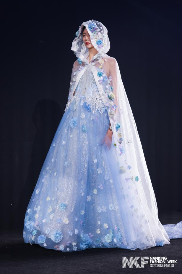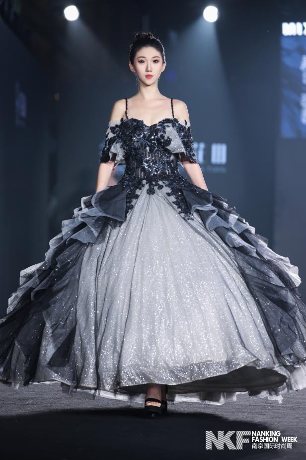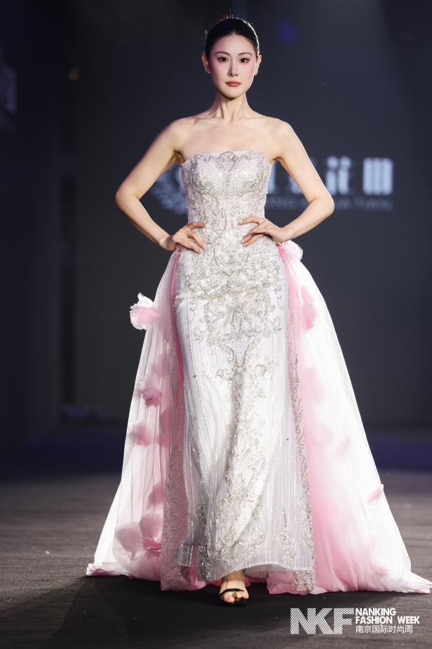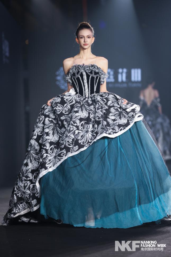 整场发布以“流光花语”为主题,通过光影与花卉的诗意交织,诠释婚纱作为情感载体的艺术表达。青绿与粉红勾勒春日的柔美,黑白对比传递庄重与永恒,缎面与轻纱材质流动相映,金属装饰细节则凸显现代新娘的独立气质。发布会作品分为四大系列:第一系列晨曦花境,以拂晓花园为灵感,运用青黛、粉黛等朦胧色调,搭配立体花卉与层叠褶皱,轻盈廓形结合缎面内衬,演绎初绽花朵的清新与希望;第二系列繁花幻影,再现正午花园的绚烂,通过大面积白色渐变与黑色收束,结合面料拼贴与金属配饰,在缎面与轻纱的混合中营造丰盈花海的视觉张力。第三系列暮色绽放,聚焦暮色时分的神秘暖调,以粉与黑为主色,运用夸张褶皱与交错廓形,在厚缎与深色薄纱的对比中,以金属饰件点缀出自然与人造共生的浪漫叙事。第四系列永恒花誓,定格誓言永恒的瞬间,以黑色为主调局部点缀粉红与青绿,通过立体花卉与极简线条的对比、缎面大裙摆与多层轻纱的结合,彰显新娘坚定优雅的光芒。
