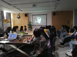 图5员工向企业工作人员提问 图6 卡宾组织员工观看卡宾先生自制微电影