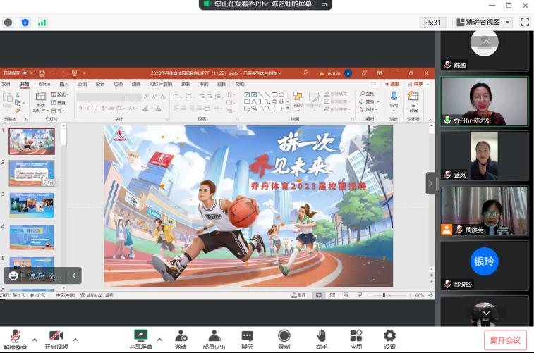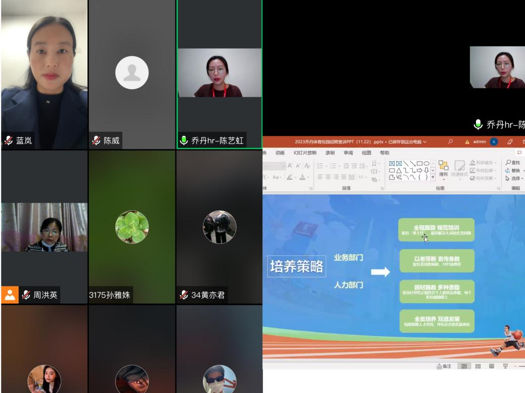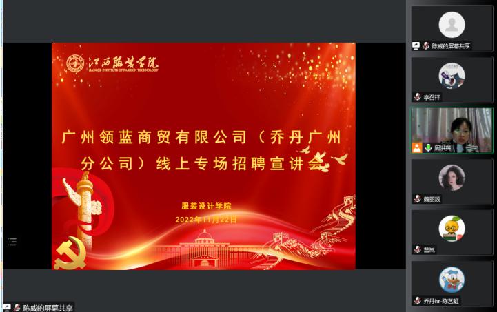 为推进公司2023届毕业生就业工作,拓宽就业渠道,促进毕业生高质量充分就业,帮助毕业生找到专业对口、心仪的工作,11月22日晚19时,广州领蓝商贸有限公司(乔丹广州分公司)受公司邀请为公司2023届毕业生举办线上专场招聘宣讲会。公司党总支书记蓝岚、副书记周洪英、就业联络员陈威、毕业班班主任以及有意向的2023届毕业生参加了此次宣讲会。会议由副书记周洪英主持。