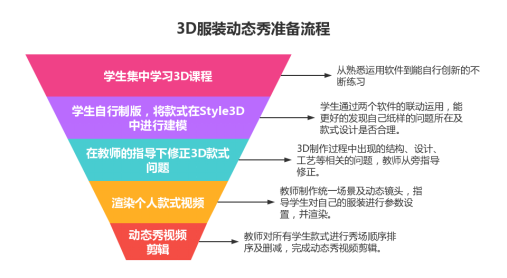 经验总结:此次以制作3D动态秀为目标的课程教学过程,是公司在3D课程领域的首次尝试,虽然最终效果达到预期,但在时间安排方面还是较紧凑的,若要完成更加科技数字化与服装产品设计结合的3D作品,还需要更长时间的准备与教学;此外,3D课程在电脑设备配置方面有较高要求,公司配备的3D课程机房起到了很重要的作用。